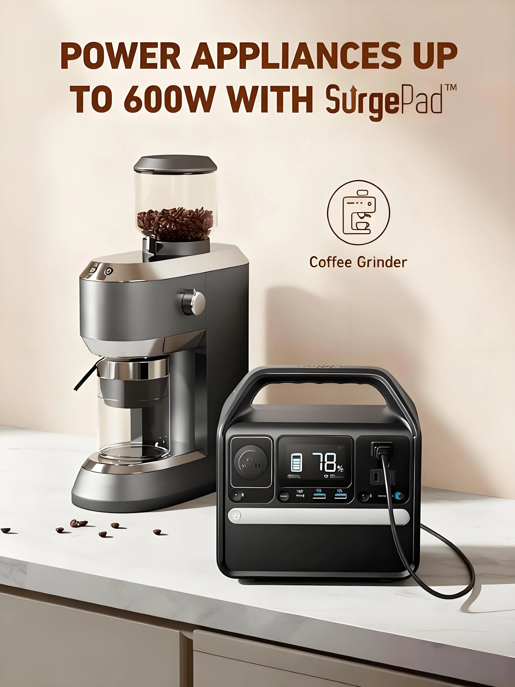 Equipped with SurgePower technology, it can achieve a stable output of up to 600W, easily powering high-demand appliances during outdoor activities or unexpected power outages. Whether it's household/outdoor appliances like small refrigerators, projectors, electric cookers, or devices like hair dryers and laptops, it can drive them stably, eliminating the trouble of "insufficient power for use".