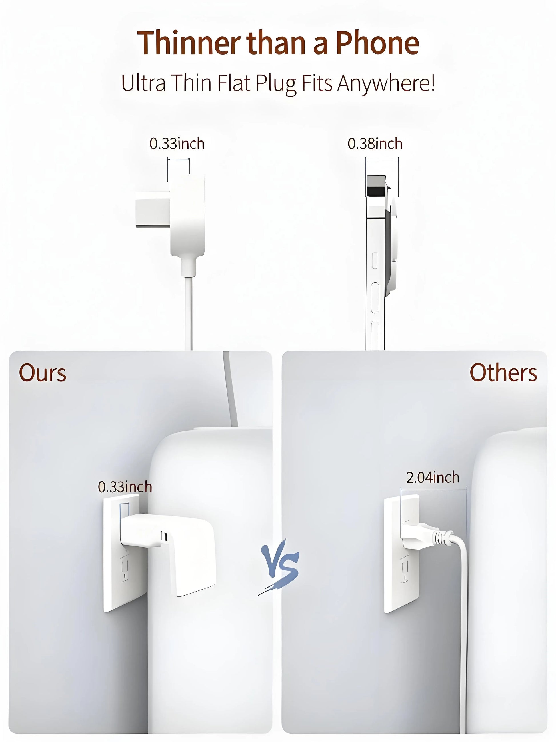 The plug is only 0.33 inches (about 0.84 cm) thick, thinner than an Apple phone and far better than the bulky size of traditional plugs. It can be easily inserted into a wall outlet and hidden behind furniture without taking up space. The 45° right-angle plug design does not block the bottom receptacle of a duplex wall outlet, maximizing the use of socket resources and avoiding interface waste when used in tight spaces like dorm rooms.