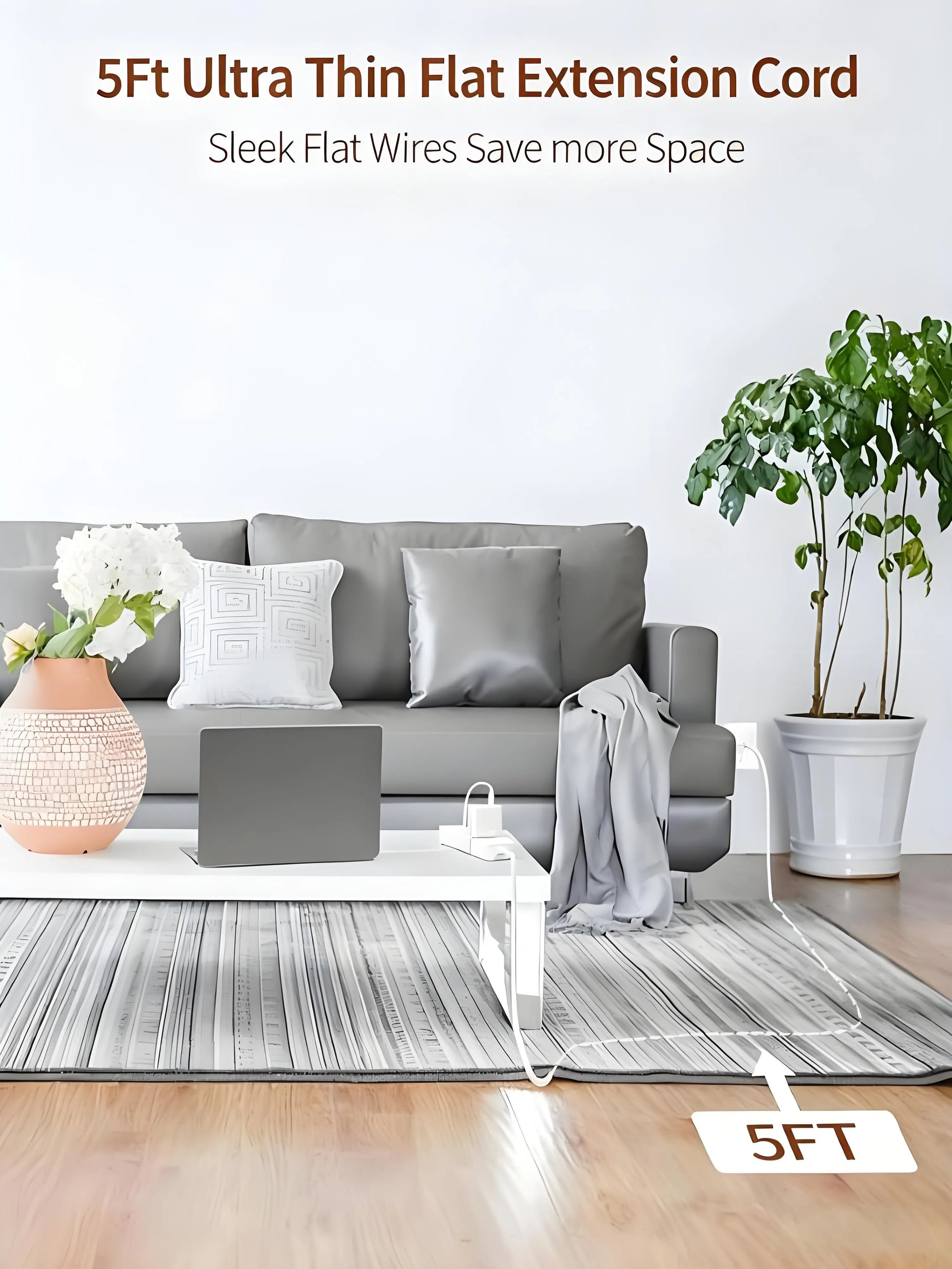 Equipped with a 5-foot (about 1.5-meter) flat extension cord, it flexibly adapts to various usage scenarios, allowing the power strip to be easily connected to a power source within the reach of devices. The cord is thin and flat, with almost no sense of foreign body when laid under the carpet. When routed under a rug or along walls, it does not create unsightly bulges or trip hazards, keeping the space tidy.